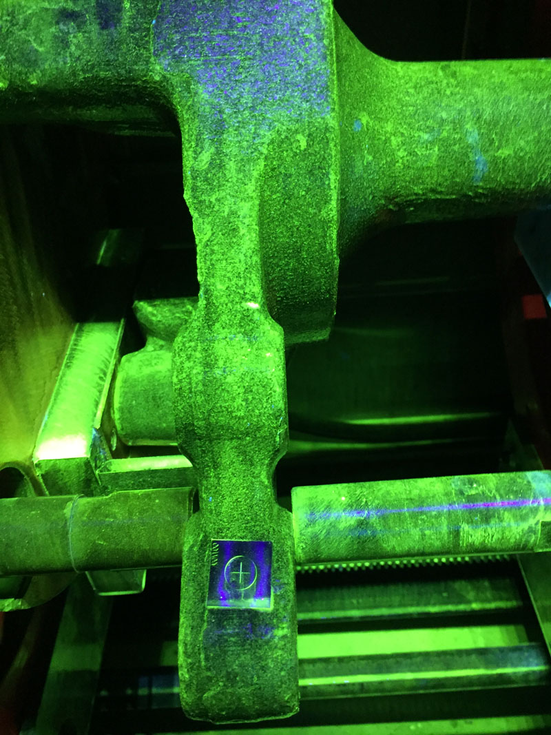 靈敏度測試:按中華人民共和國機械行業(yè)標準JB/T6065—92《磁粉探傷用標準試片》規(guī)定,以標準2號A型試片測試,顯示清晰。